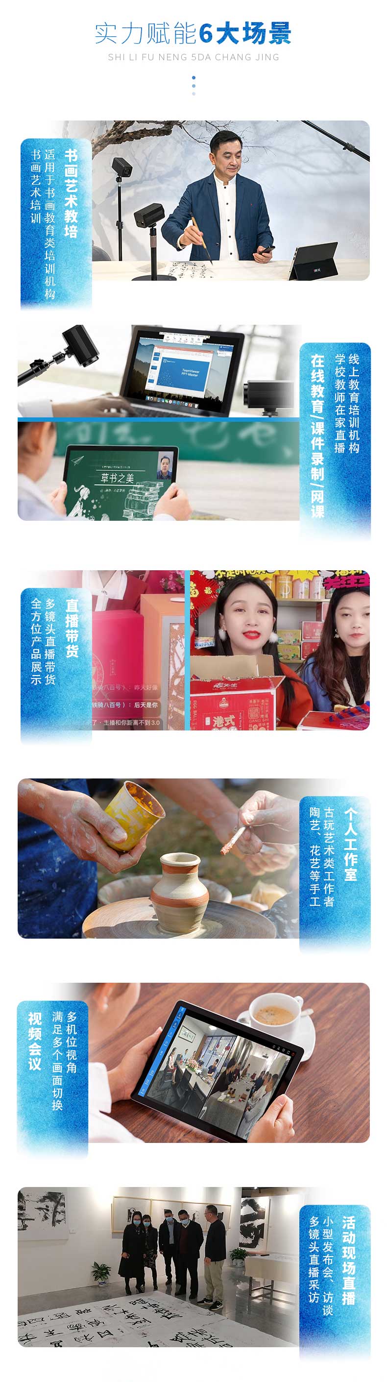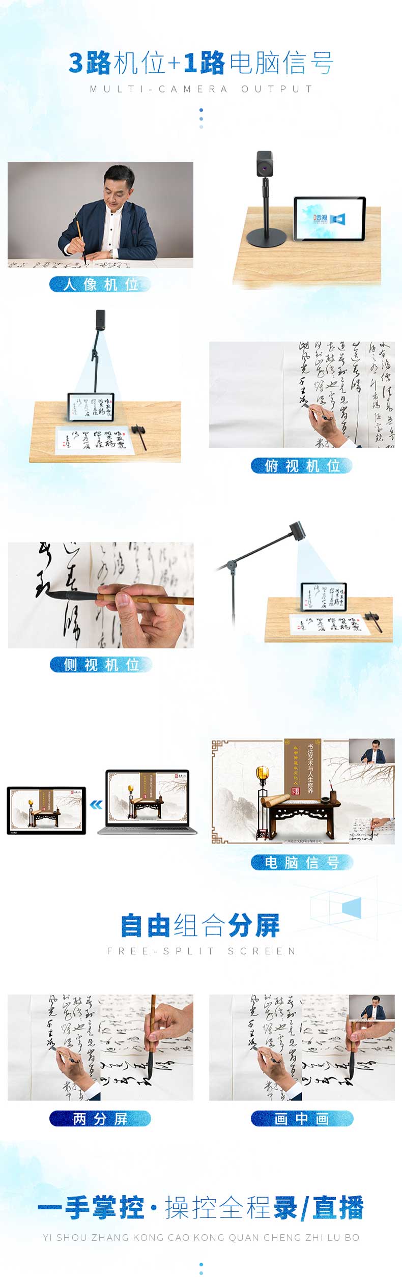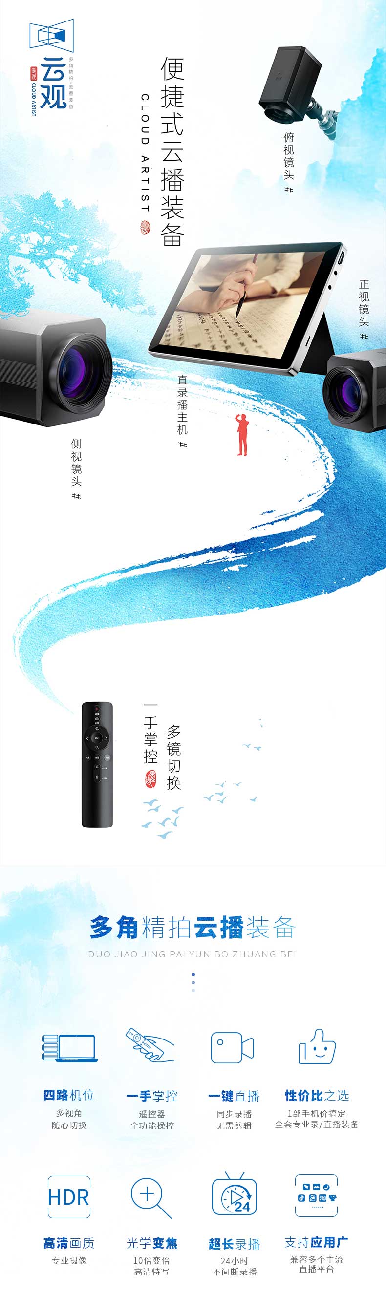 云观是专为课件录制、教育培训、文化艺术、文玩珠宝、自媒体等在线录/直播而开发的多机位录/直播设备。云观在设备上进行了创新型的革新,三路高清摄像头机位和一路电脑信号,画质升级,人像、俯拍、侧拍三路不同拍摄角度增加录/直播的可看性。一个人就能轻松完成,即使是科技产品小白,也能即刻上手。适用于书法教学录/直播、古琴线上教学、手工艺教学等场景,支持小鹅通、钉钉、腾讯会议等多种主流直播软件。