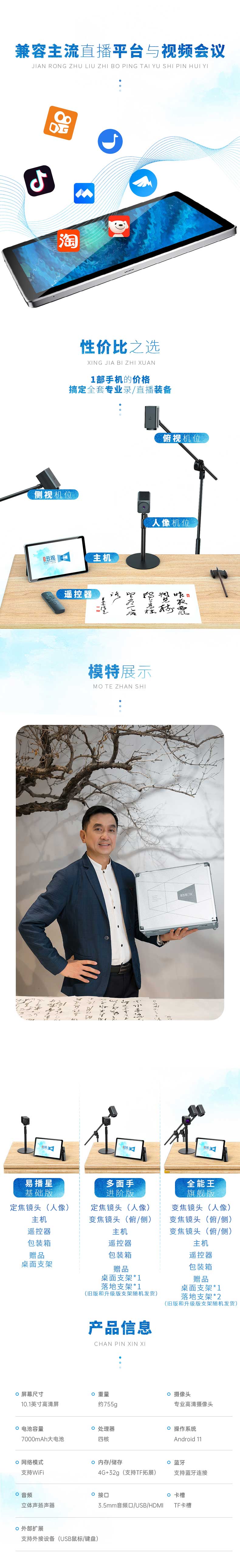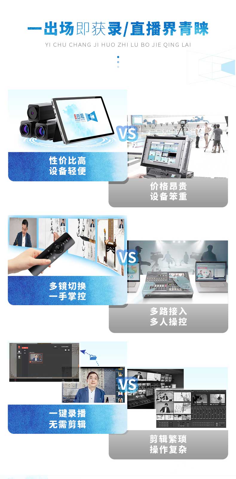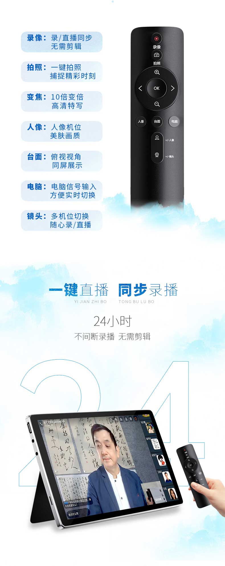 云观是专为课件录制、教育培训、文化艺术、文玩珠宝、自媒体等在线录/直播而开发的多机位录/直播设备。云观在设备上进行了创新型的革新,三路高清摄像头机位和一路电脑信号,画质升级,人像、俯拍、侧拍三路不同拍摄角度增加录/直播的可看性。一个人就能轻松完成,即使是科技产品小白,也能即刻上手。适用于书法教学录/直播、古琴线上教学、手工艺教学等场景,支持小鹅通、钉钉、腾讯会议等多种主流直播软件。